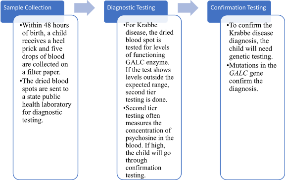 Krabbe disease can be easily diagnosed by testing the GALC enzyme’s activity, especially in white blood cells. This can be taken from blood samples, skin cells, or amniotic fluids. In certain places in the U.S., it is required to scan newborns for the disease. When newborns are screened, GALC is measured via a liquid chromatography test. Blood can also be taken from the baby if necessary. If any abnormal GALC readings come up, additional testing is to follow suit. This further testing typically includes the measurement of the psychosine concentration. Occasionally, the testing consists of a sequence analysis of the GALC gene. The most common mutation of the GALC gene is the GALC 30-kb deletion. The measurement of the psychosine concentration is often more accurate than the GALC activity, considering that there are many mutations to the GALC gene that are harmless or not disease-causing. Elevated psychosine levels are those any higher than 10 nmol/L, which would support the diagnosis of infantile Krabbe disease. If the levels are less than 2 nmol/L, it would be safe to assume that that individual does not have the disease. Any value between those would support the diagnosis of later-onset Krabbe disease in that individual.
