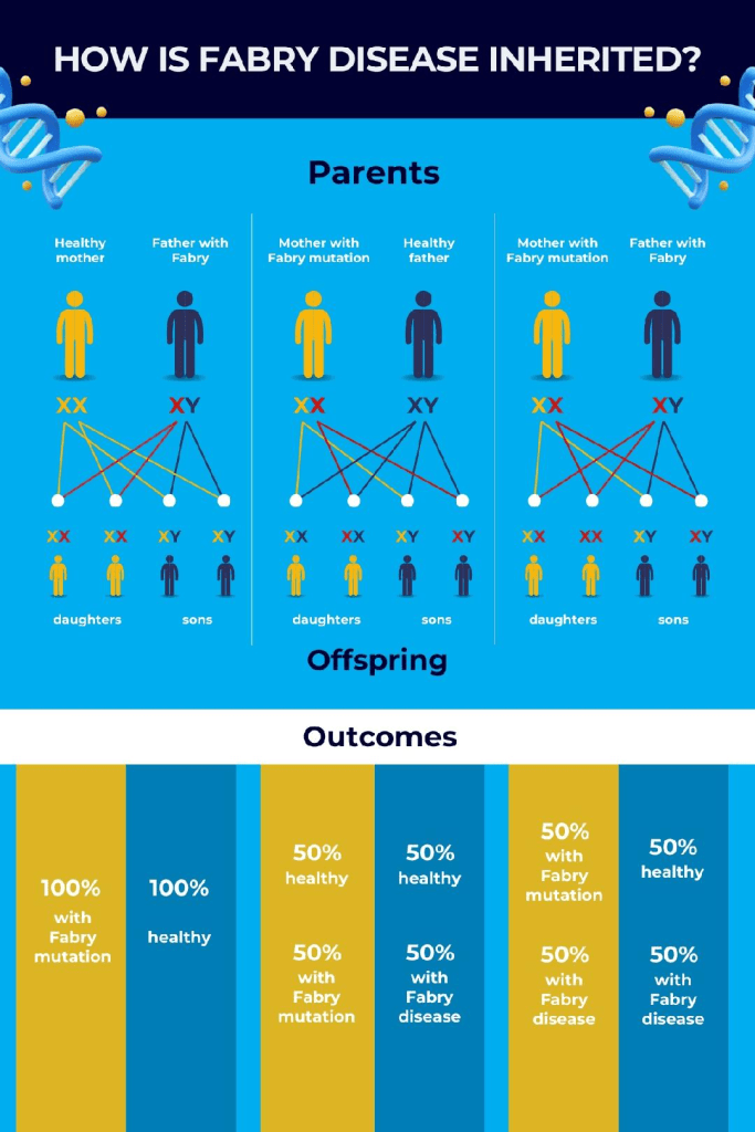 Males with Fabry disease will always transmit the disease to their daughters and not their sons. Females, however, have a 50% risk of transferring the disease to their children with each pregnancy, this goes for any pregnancy, regardless of the gender of the child.