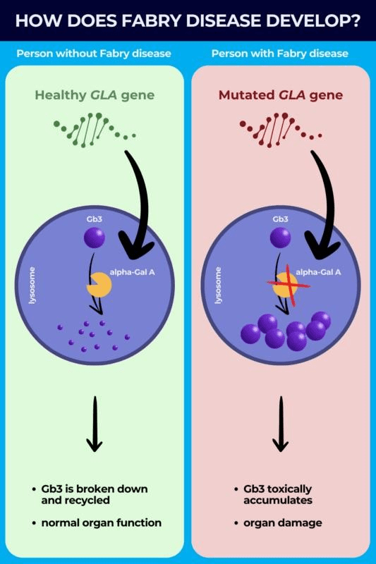 Fabry disease is a genetic, inheritable disorder affecting the metabolism of a certain fat. This is marked by a deficiency or significant lack of the lysosomal enzyme in the affected person’s body: α-galactosidase A (α-Gal A). This deficiency is caused by the mutations in the GLA gene, causing the body’s cells to improperly form α-Gal A. Lysosomes are the break-down centers of cells, responsible for digesting specific chemical compounds. α-Gal A is responsible for digesting glycolipids, specifically, globotriaosylceramide (GL-3). When the cells are deficient in α-Gal A, there is a resulting build up of GL-3 and other similar glycolipids in the cells. This tends to result in organ dysfunction and other abnormalities. This tends to affect the heart, kidneys, and blood vessels.
