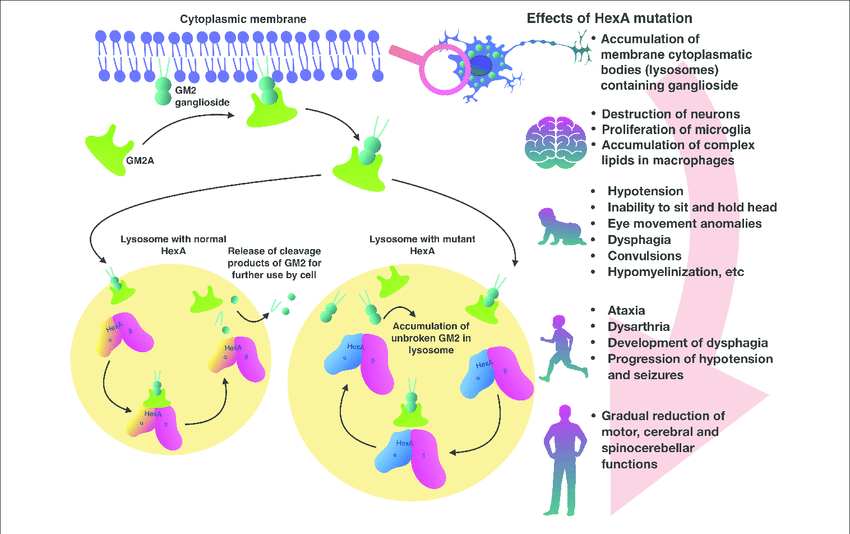 Tay-Sachs disease is a neurodegenerative orhpan disease caused by a severe deficiency of the enzyme b-hexosaminidase A. This enzyme is meant to break down fats in the brain, without it, these fats begin to accumulate in the brain, as well as other organs. This progressive accumulation corresponds to the progressive dysfunction of the nervous system. Being a lysosomal storage disease, an individual with Tay-Sachs disease lacks the means to properly break down large molecules, like fats, in the lysosomes of their cells. This causes fats and carbohydrates to build up in the lysosomes, causing these cells to eventually die, which will trigger and inflamatory response, causing further damage to the surrounding tissues.