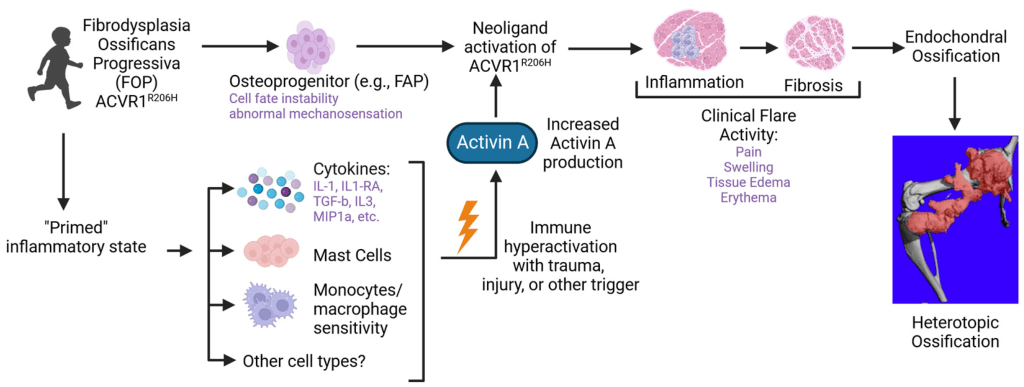 Episodic flare-ups (inflammatory swelling of soft tissues) in FOP typically start in early childhood and continue to worsen over time. The majority of FOP cases arise from a spontaneous mutation in the ACVR1 gene, which is part of the bone morphogenetic protein (BMP) signaling pathway. This pathway plays a crucial role in both the development of the skeleton during embryonic stages and the repair of the skeleton after birth.