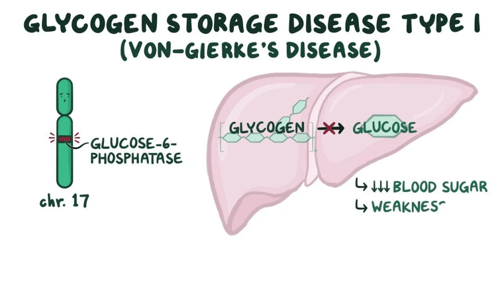 Type I glycogen storage disease (GSDI) is a rare inherited condition that affects how the body processes and stores sugar and fat. It happens when there’s a problem with one of two specific genes. About 80% of cases are caused by a missing or faulty enzyme called glucose-6-phosphatase, and this form is known as type Ia. The other 20% are caused by a problem with a related transporter enzyme, and this is called type Ib. In both cases, the body ends up storing too much sugar (in the form of glycogen) and fat in tissues, which can lead to health problems. The condition is passed down in families through a recessive pattern, which means a child must inherit one faulty gene from each parent to be affected. If both parents are carriers (each has one non-working copy), there’s a 25% chance with each pregnancy that their child will have the disease, a 50% chance the child will be a carrier like the parents, and a 25% chance the child won’t inherit the disease at all. Boys and girls are equally likely to be affected.