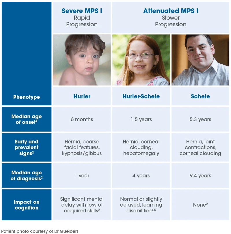 The presentation of MPS I varies widely and is best understood as a disease spectrum. Individuals are generally categorized as having either a severe or attenuated form of the condition, depending on factors such as age at symptom onset, rate of progression, and involvement of the brain. In severe cases, symptoms typically appear by six months of age and are associated with rapid progression, including early intellectual decline. Without treatment, affected individuals with the severe form often die within the first decade of life. On the other hand, the attenuated form presents later, sometimes not until after age three, and progresses more slowly. Intelligence is typically preserved in these individuals, and many can live close to a normal lifespan.