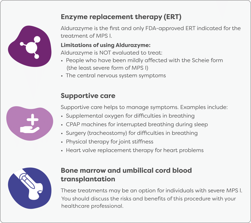 Treatment for mucopolysaccharidosis type I (MPS I) involves three main components: replacing the missing enzyme, managing symptoms, and offering genetic counseling to affected families.