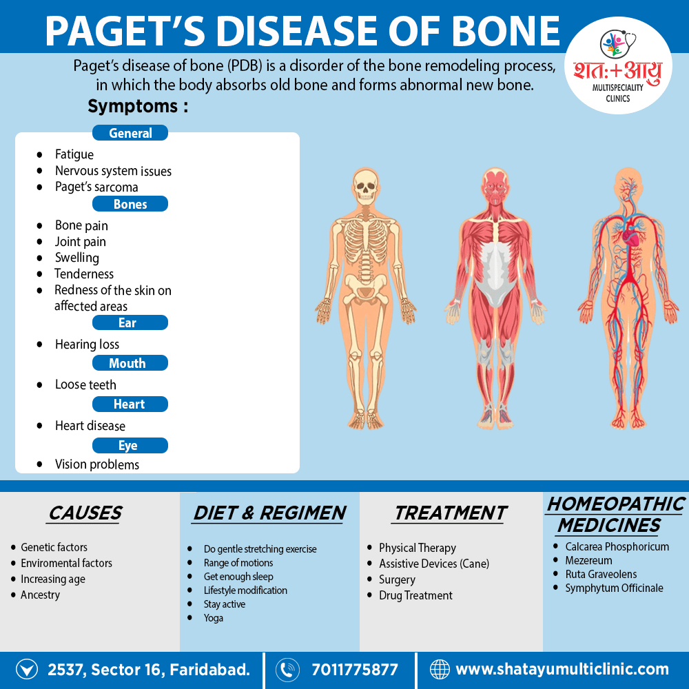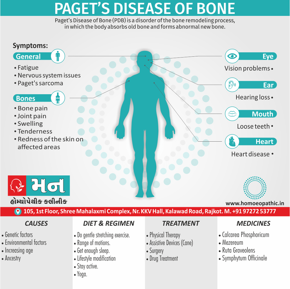 Paget’s disease of bone is a long-term condition that develops gradually and affects the skeleton. It involves unusually fast breakdown and rebuilding of bone. The new bone that forms is often dense but weak and structurally abnormal. This can lead to symptoms such as bone pain, joint problems, deformities and fractures. The disease most often affects bones in the spine, skull, pelvis and lower legs. The exact cause of Paget’s disease remains unknown.