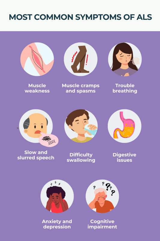 Amyotrophic lateral sclerosis (ALS) is a disease that causes nerve cells in the brain, brainstem, and spinal cord to slowly stop working and die. These nerve cells, called motor neurons, help the brain send signals to the muscles that control movement. Normally, motor neurons in the brain send messages to those in the spinal cord and brainstem, which then pass the signals to the muscles. In ALS, both sets of motor neurons are damaged, so messages from the brain cannot reach the muscles. Over time, the muscles become weaker and smaller, making it hard to move, speak, swallow, hold up the head, or breathe. The disease continues to worsen and eventually causes breathing failure because the chest and diaphragm muscles no longer work. Treatments that can slow ALS have only limited effects, so care mainly focuses on managing symptoms and providing supportive, team-based care.