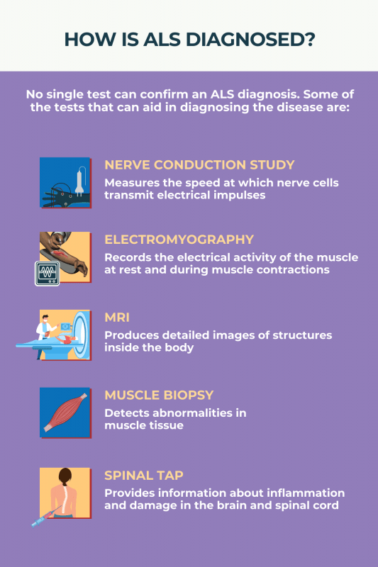 Tests that measure how well nerves and muscles work, such as electromyography (EMG) and nerve conduction studies (NCS), can help confirm that the motor neurons are not functioning properly. Brain scans such as magnetic resonance imaging (MRI) are also done to make sure the symptoms are not caused by another disease.