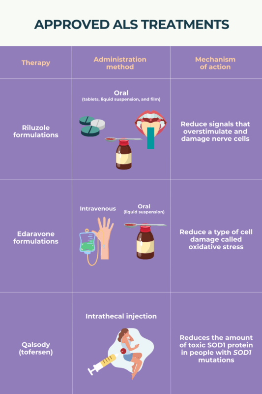 ALS treatment focuses on two main areas: therapies that can slow the disease and treatments that manage symptoms and help maintain comfort and function. There is currently no cure for ALS.