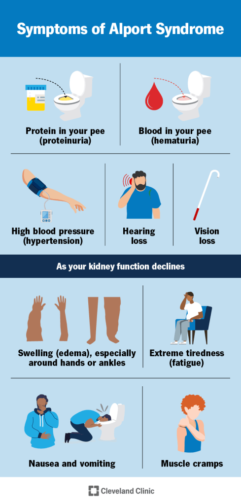 Alport syndrome is a rare inherited condition that mainly affects the kidneys, hearing, and eyes. It causes blood in the urine early in life and gradually leads to worsening kidney function over time, which can eventually result in kidney failure. Hearing loss may develop and gradually worsen, while eye changes are common but usually do not affect vision.