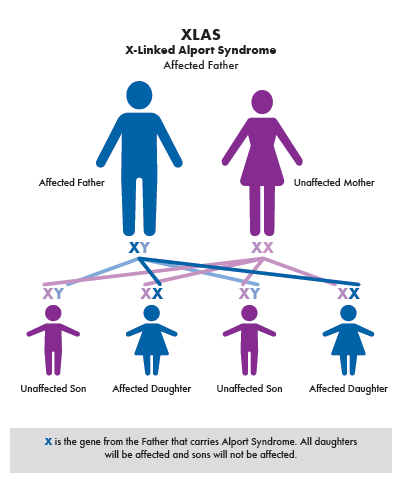 Alport syndrome is caused by harmful changes in certain genes that provide instructions for making proteins essential to normal body function. When these genes do not work properly, the proteins they produce may be missing or defective, which can damage organs such as the kidneys, ears, and eyes. The most common form is X-linked Alport syndrome, which is caused by changes in the COL4A5 gene on the X chromosome. Because males have only one X chromosome, they are more likely to develop the disease if they inherit the altered gene. Females have two X chromosomes, so those with one altered gene are often carriers and may have mild or no symptoms. Carrier females have a one in four chance with each pregnancy to have an affected son, a carrier daughter, an unaffected son, or a non carrier daughter. Affected males pass the altered gene to all of their daughters but not to their sons.