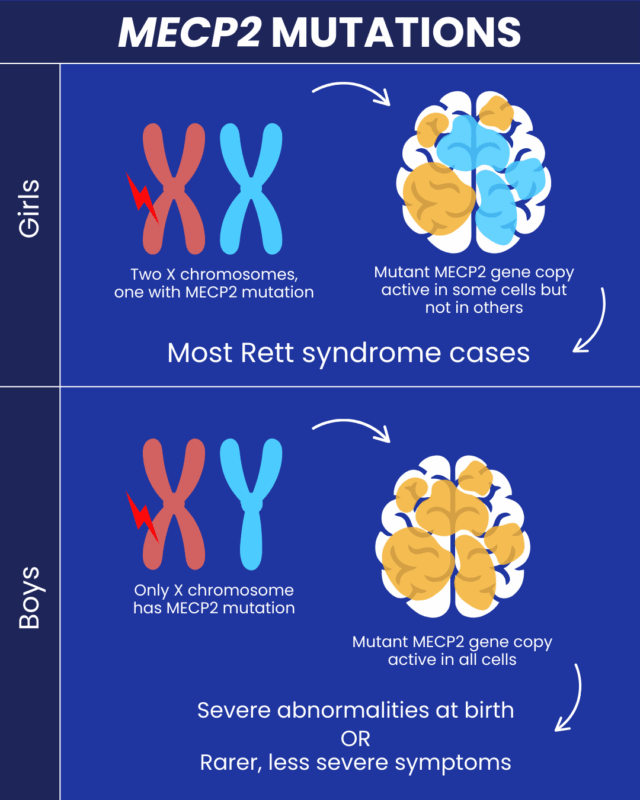 In very rare cases, Rett syndrome may be inherited from a mother who carries the MECP2 mutation but has no symptoms or only mild ones. This can happen when the normal X chromosome is more active than the mutated one due to a process called random X chromosome inactivation. If a mother is a known carrier of the mutation, each child has a 50 percent chance of inheriting it. Random X chromosome inactivation is a natural process in females, who have two X chromosomes, while males have one X and one Y chromosome. In each female cell, one X chromosome is randomly turned off. Sometimes the chromosome carrying the mutation is mostly silenced, which can lead to mild symptoms. In other cases, the healthy X chromosome may be mostly silenced, resulting in more severe symptoms.