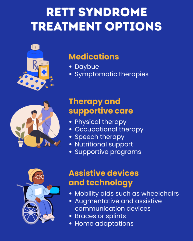 Treatment for Rett syndrome focuses on managing the specific symptoms each individual experiences. Care usually requires a multidisciplinary team of healthcare professionals, which may include pediatricians, neurologists, gastroenterologists, speech therapists, psychiatrists, nutritionists, and other specialists. Genetic counseling can also be helpful for affected individuals and their families.